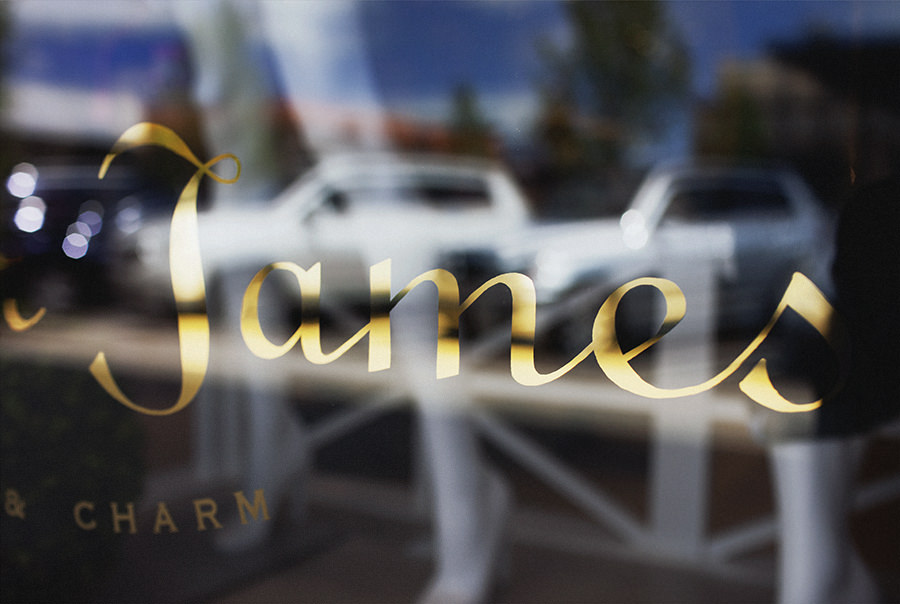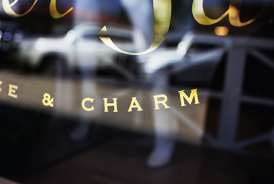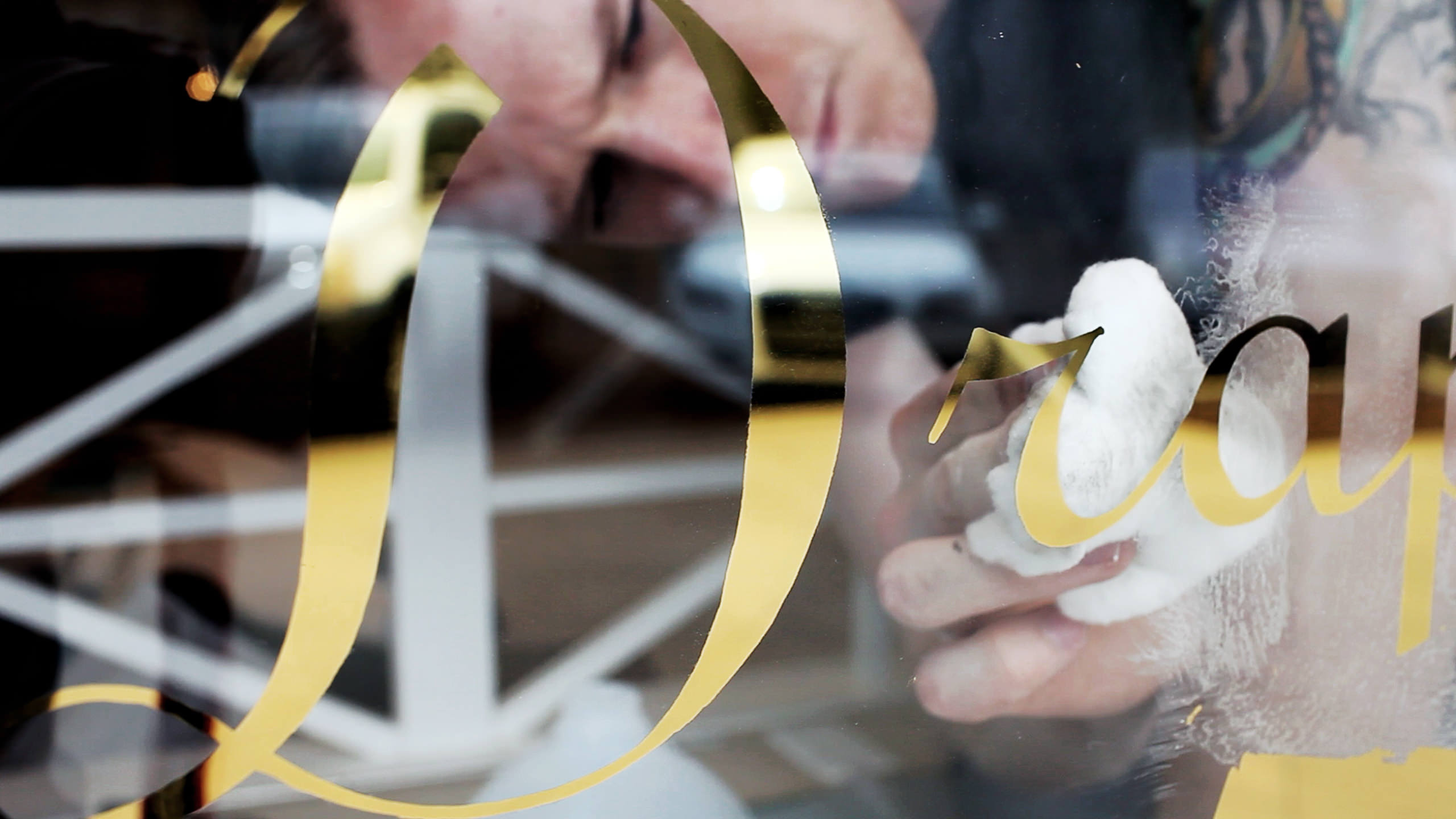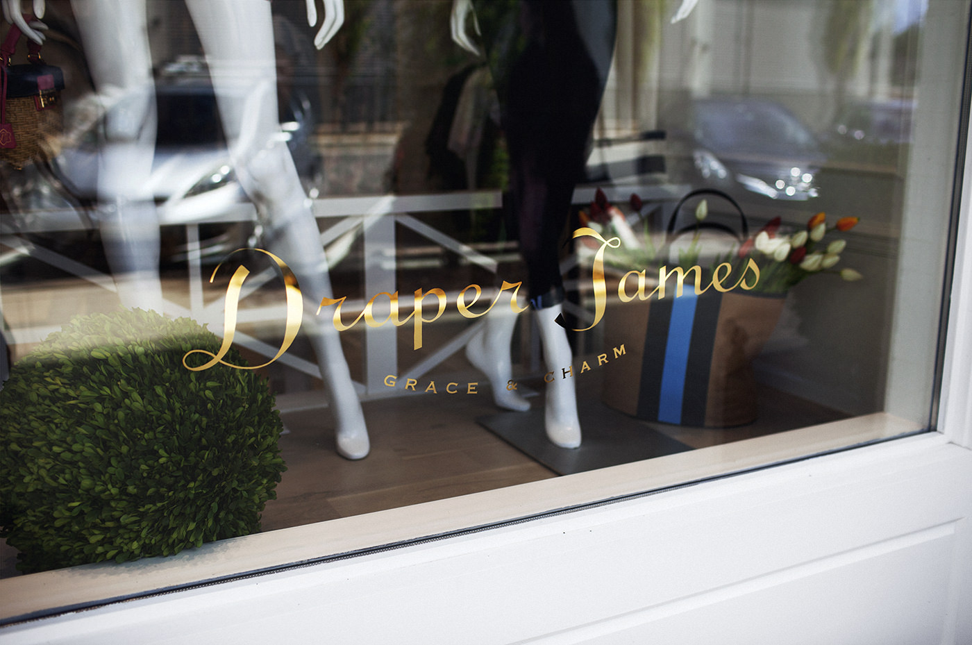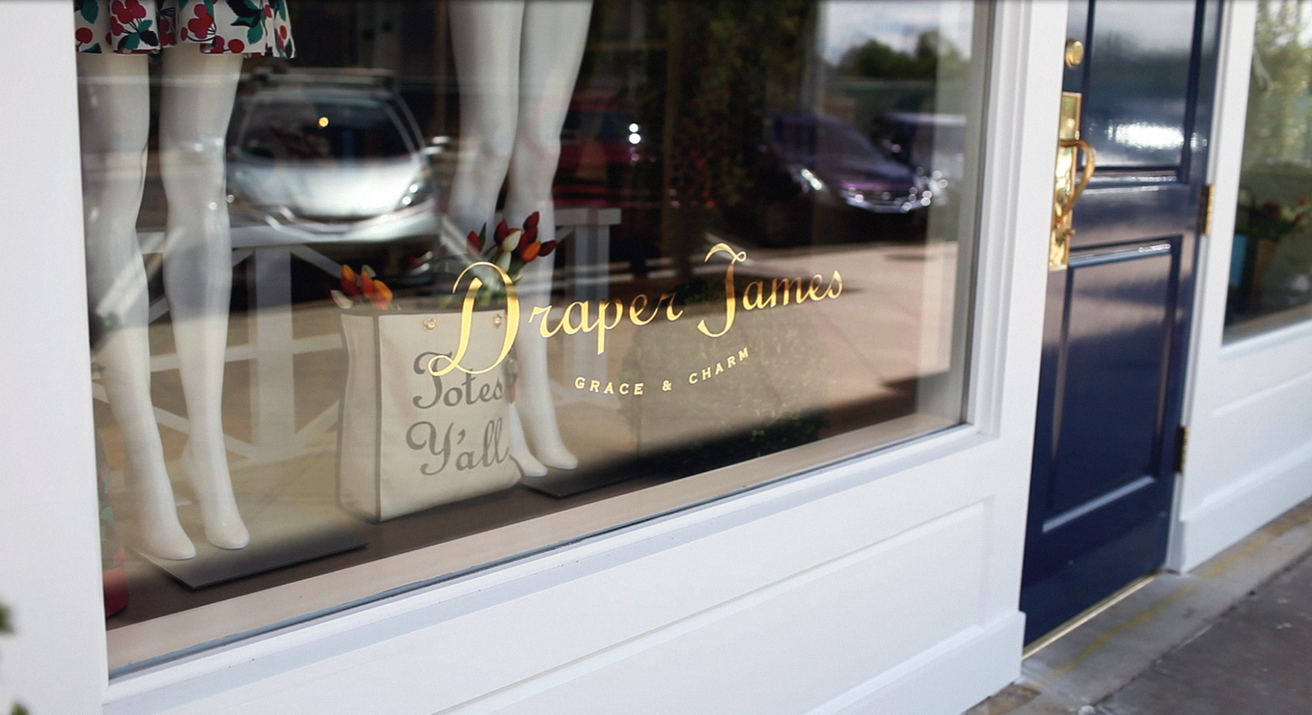Draper James is a southern clothing boutique created by Reese Witherspoon. Their retail stores are extremely detailed oriented and spare no expense in creating an upscale traditional southern charm look and feel. Part of that truly classic presence required that their large storefront window signs be hand painted and gilded with real 23k gold leaf.